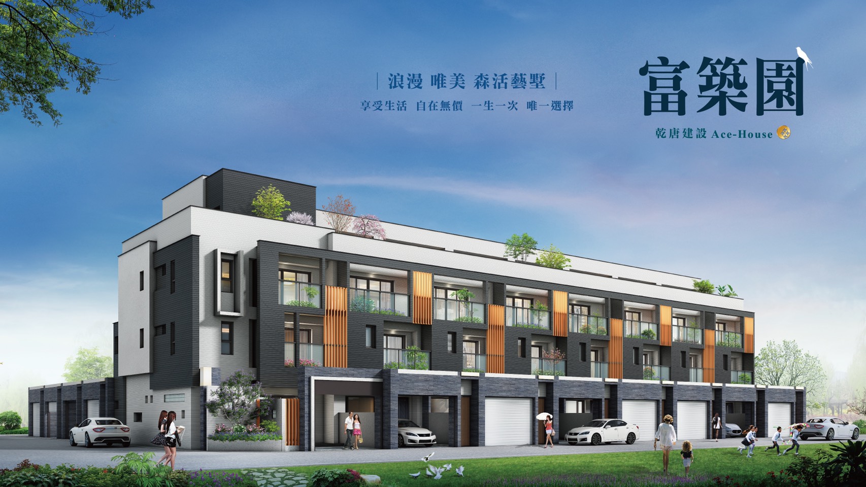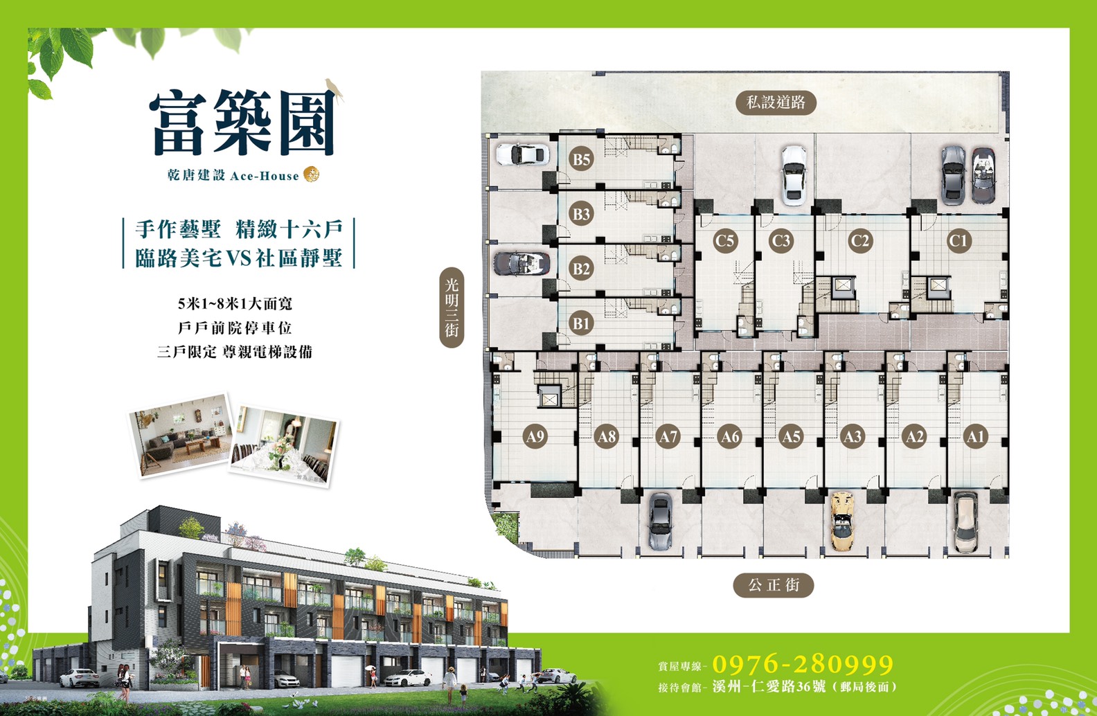 「富築園」位於彰化縣溪州鄉公正街與光明三街路口,由乾唐建設有限公司投資興建,富悅營造有限公司營造,劉晉綱建築師事務所建築設計,基地面積450坪、建蔽率60%,樓層規劃為16棟地上3、4層建築,共有16戶住家,格局坪數規劃地坪23~66坪、建坪47~81坪。