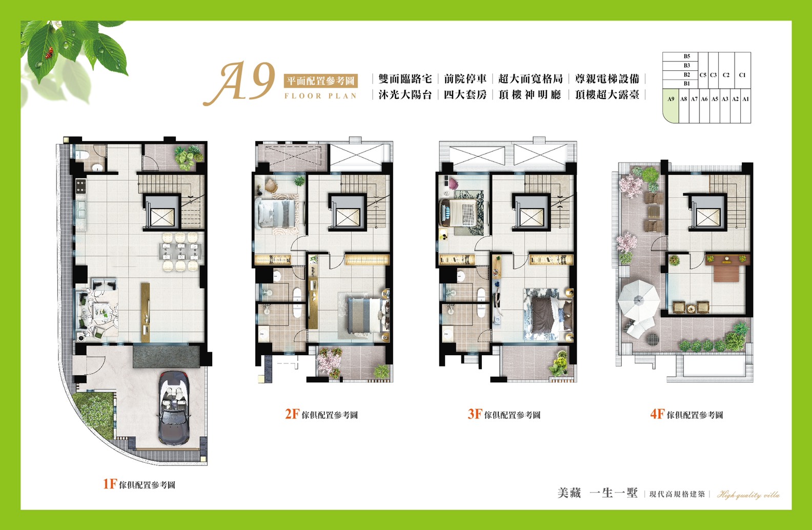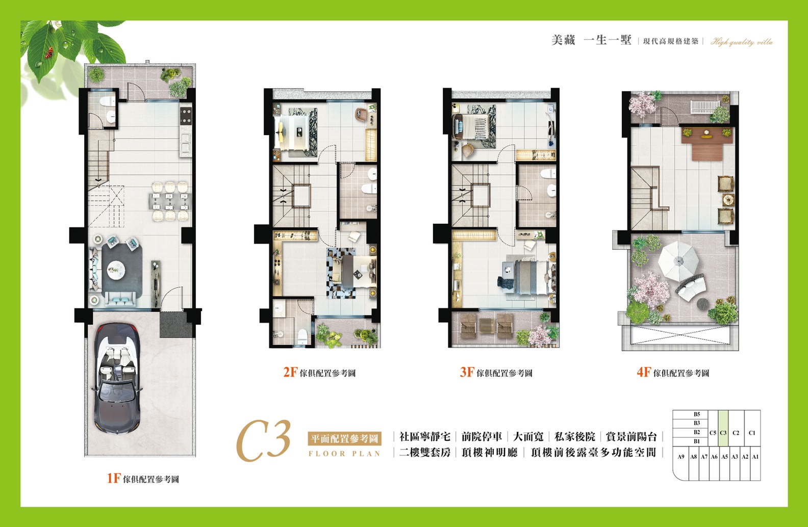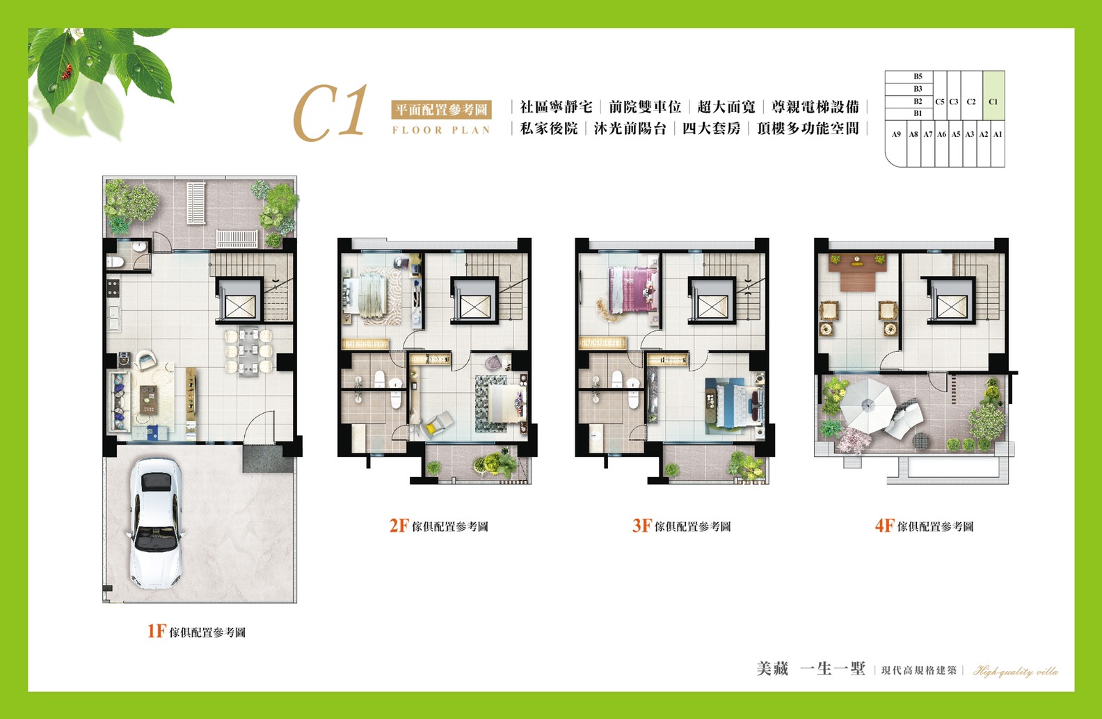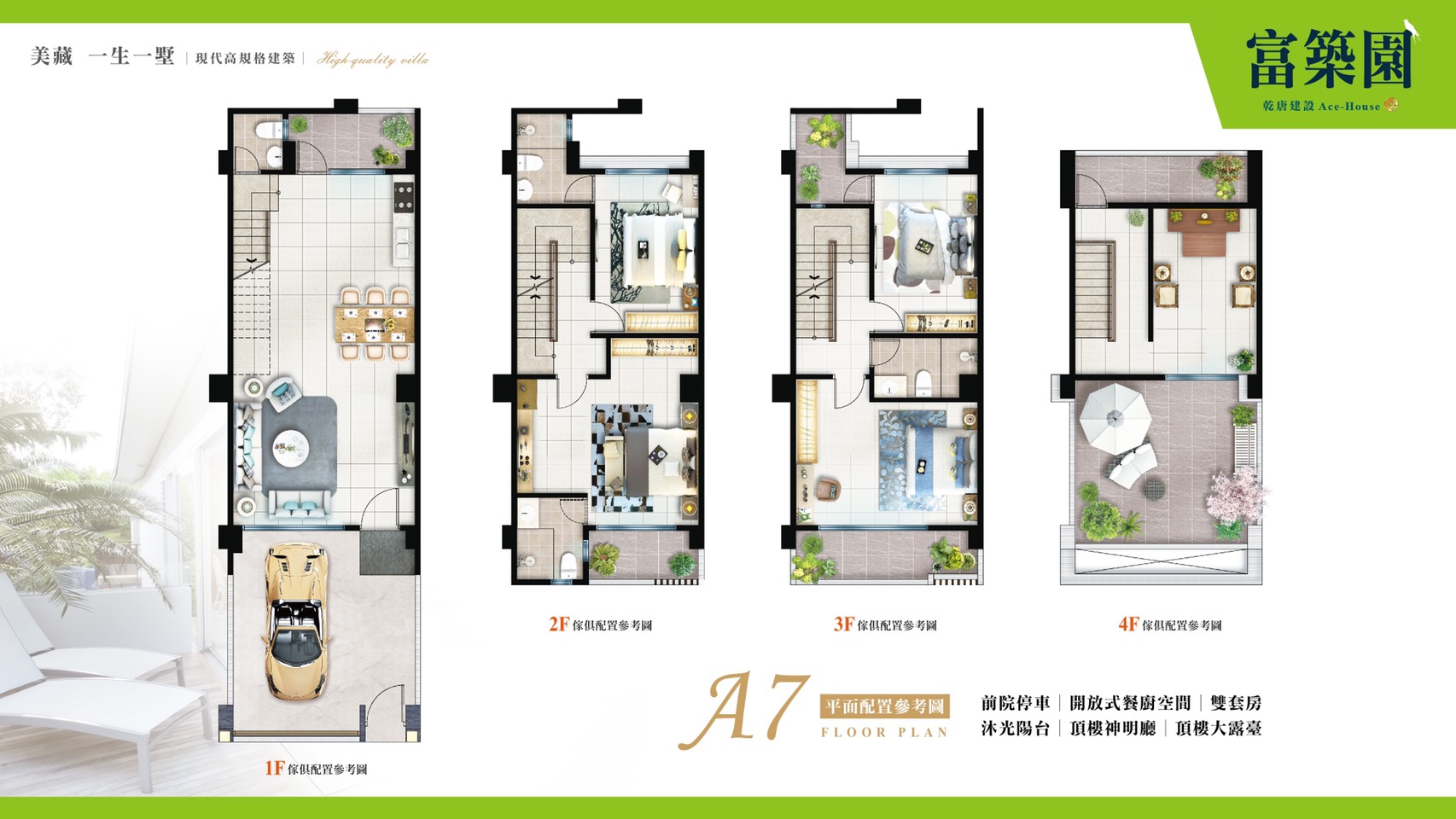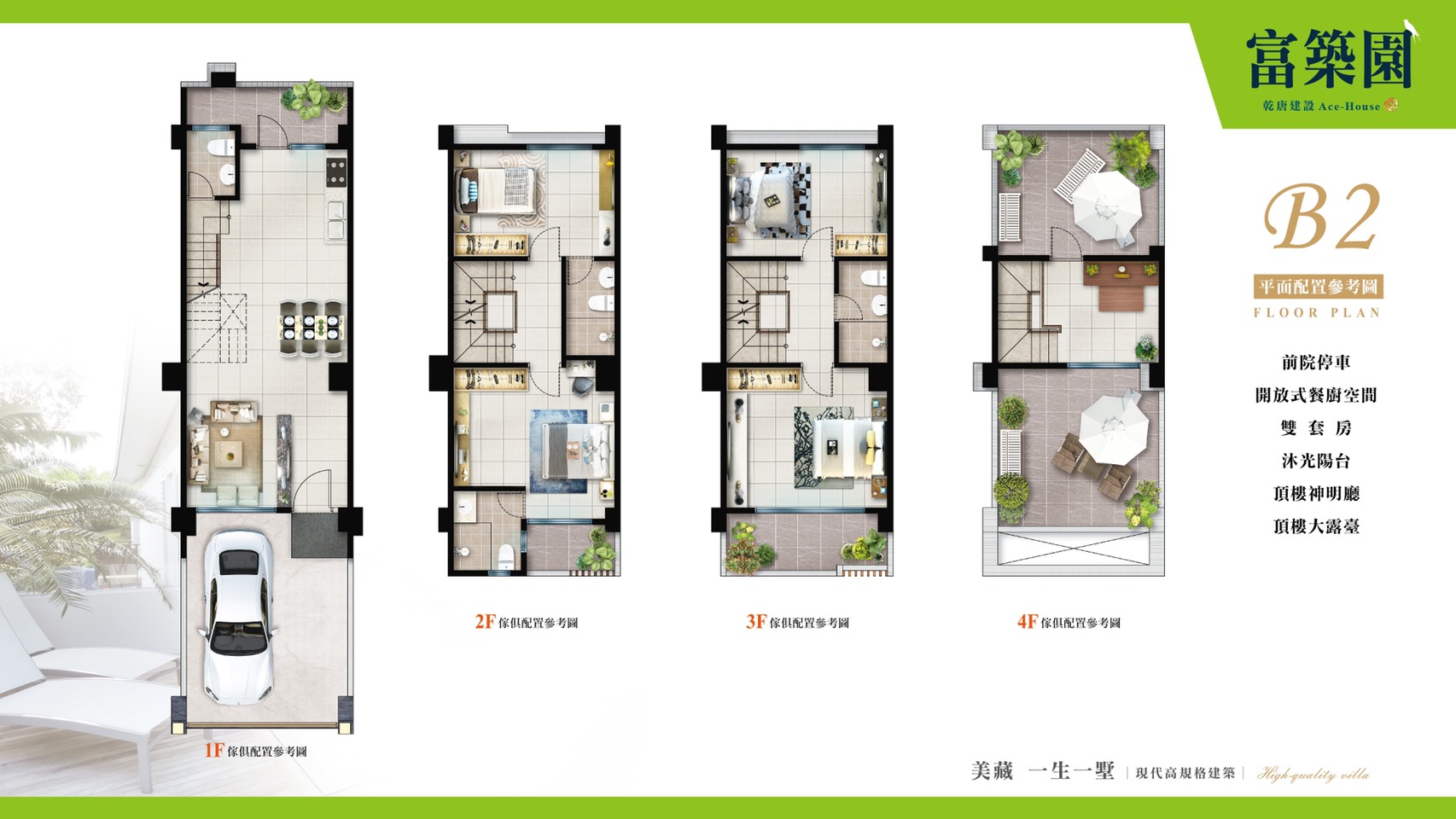 車位規劃1樓停車,結構採RC鋼筋混凝土,建材有正字標記氣密窗。